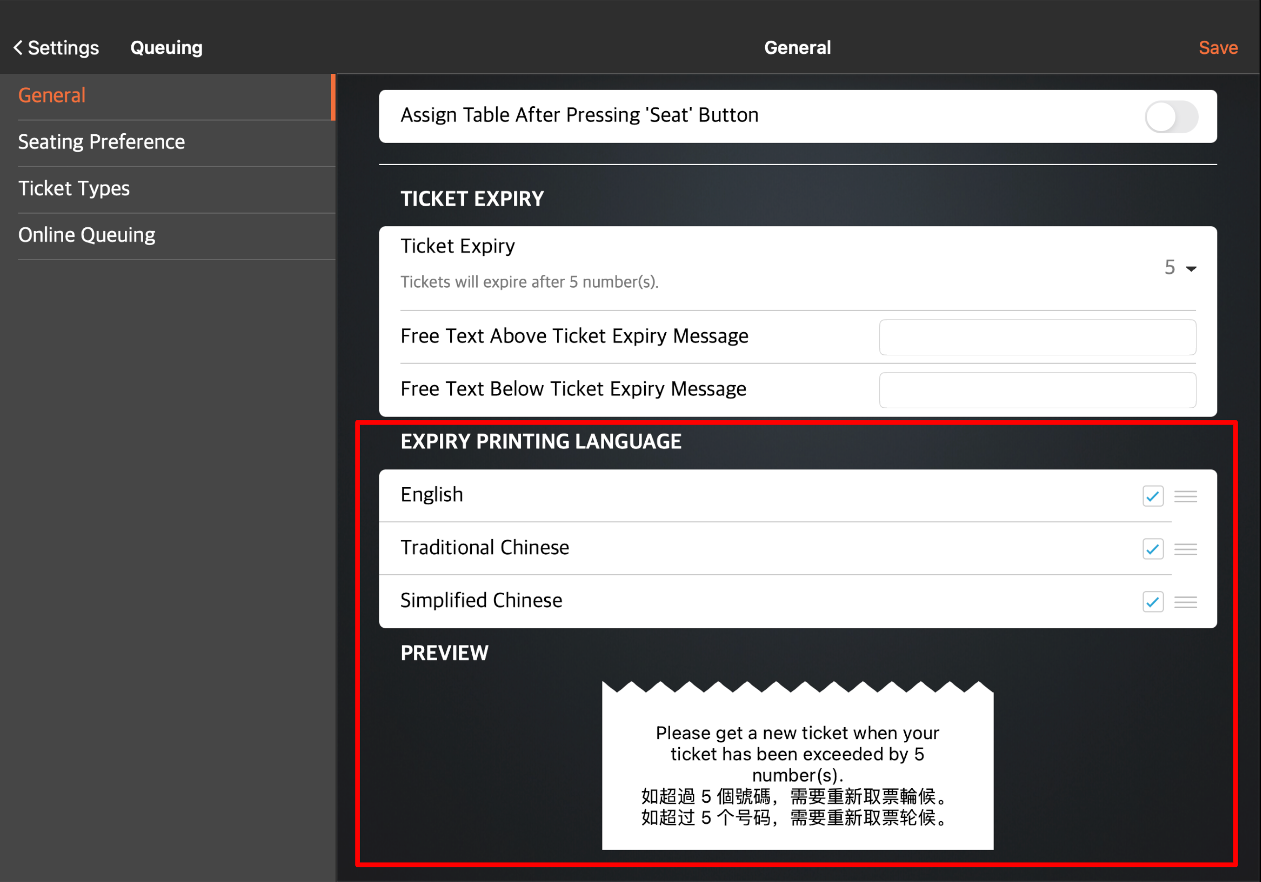 - 您可以選擇以多種語言顯示期限信息。若要進行此設置,請勾選您希望在輪候票上顯示的語言旁的複選框。